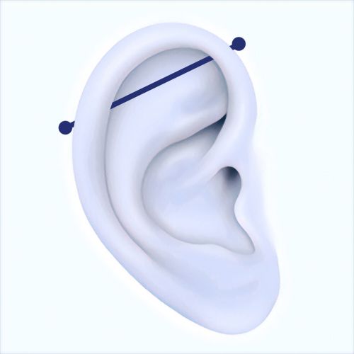 De industrial piercing zijn eigenlijk twee helix piercings die met elkaar zijn verbonden met een lange straight barbell. De genzing kan hierdoor erg moeizaam gaan en moet er extra aandacht besteed worden aan de nazorg. Voor alle kraakbeenpiercings geldt dat er geen druk op moet komen bij het slapen, maar bij deze piercing is het nog belangrijker dat je er echt niet op moet liggen. We zetten deze piercing met behulp van een needle receiving tube en twee canulenaalden. Als eerste sieraad wordt in principe een 1.6 mm dikke straight barbell gebruikt van titanium. Let op: Deze piercing kan alleen gezet worden als de anatomie van het oor zodanig is dat het gebogen stuk kraakbeen (helix) aan beide kanten van het oor voldoende ontwikkeld zijn.